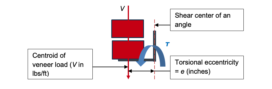 • A second reason to restrain the angle is evident from the loading on the angle as shown in Figure 7. Recognizing an angle’s shear center (line at which vertical load will not create torsion) is at the vertical leg, the vertical load of the veneer produces torsion on the section (T = V x e in-lbs/ft).