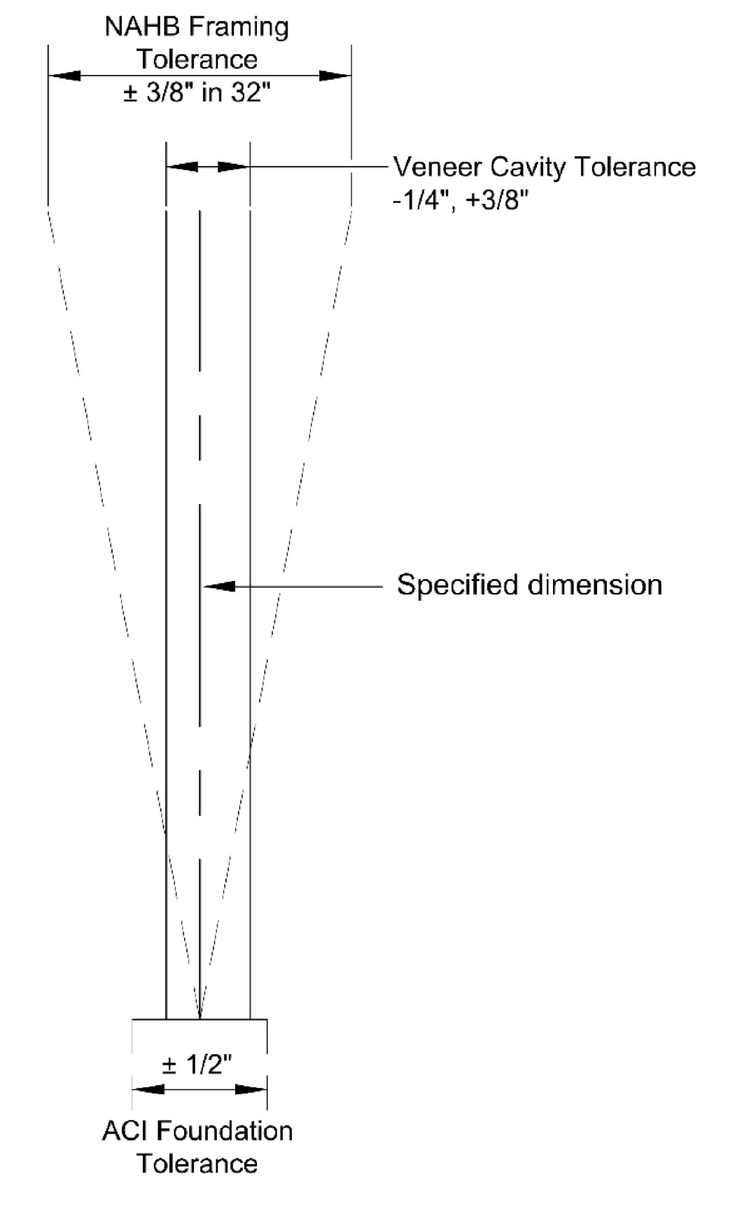 Although codes do not require masonry veneer to meet listed construction tolerances, it is reasonable to apply one of the listed requirements to veneer drainage cavities. TMS 602 Section 3.3 F (c) requires: “Grout space or cavity width, except for masonry walls passing framed construction........-1/4”, + 3/8”. That means that if the cavity was specified to be 2” wide, it can be between 1 3/4” and 2 3/8” and still be within code limits. This tolerance does not apply for “walls passing framed construction” including where veneer extends past floor slabs, spandrel beams, or other structural elements, for the exact reason discussed above: construction tolerances for framed walls exceed that for masonry, and TMS 602 statement relieves the contractor in cases of conflicting conditions. (See Figure for comparison of concrete, wood framing, and masonry tolerances.)
