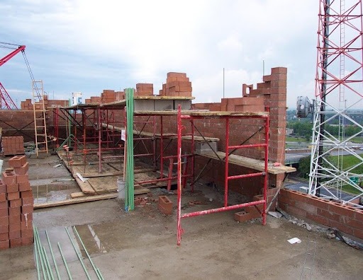 For tight lots, it is possible to construct structural load-bearing and shear walls from the inside of the building (inside-out construction), eliminating the need for exterior scaffolding to install brick veneer. This system is accomplished using a structural curtain wall system. The reinforced structural veneer walls are self-supporting, full height, and only tied back to the floors at discrete points for out-of-plane loads. For this system interior bearing and shear walls are constructed simultaneously with the exterior reinforced masonry enclosure wall working from the established floor plate. Once the exterior walls are placed to a level several courses above the next floor level, and the interior walls are placed up to the bearing elevation of the next upper floor, the next floor is erected, exterior walls are tied back, and the process of constructing the interior and exterior walls is repeated, level by level. Continuous interior rigid insulation can be applied and taped to create the A/W/V barrier, tied to through-wall flashing, and then light gauge framing (22- to 25-gauge steel studs) can be added for electrical distribution and interior finishes. The result is a building with a brick facade, without the need for scaffolding, without the need for the thousands of brick ties, and without the need for heavy gauge exterior wall steel stud framing. Construction cost is decreased, and construction speed is increased. This method has been used on over half a dozen buildings ranging in height from 12- to 17-stories, on various apartments and hotels.