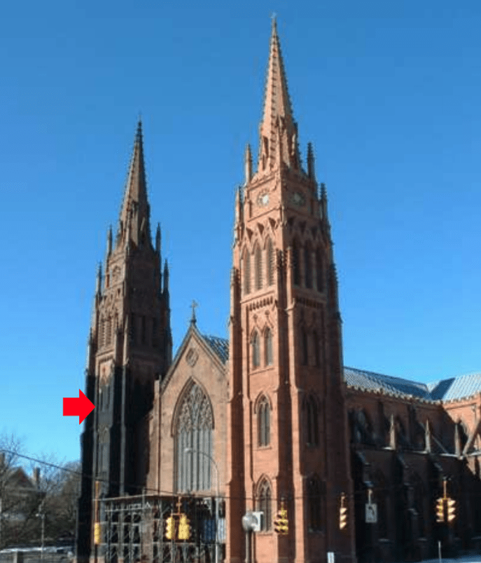 There are several approaches to tower stabilization and protection that have been used. Figure 1 shows a brownstone-clad cathedral that was constructed in stages (begun in 1848 and completed in 1902). The lower half of the left tower (arrow) is shrouded in protective netting to prevent shards or chips of brownstone from falling into pedestrian areas. The center entryway is protected with walkway protection to catch any falling debris. The overall façade above those areas was determined to be stable but spalling of the brownstone was a hazard to passersby. So, netting and walkway protection was appropriate but was not used as a true structural stabilization.