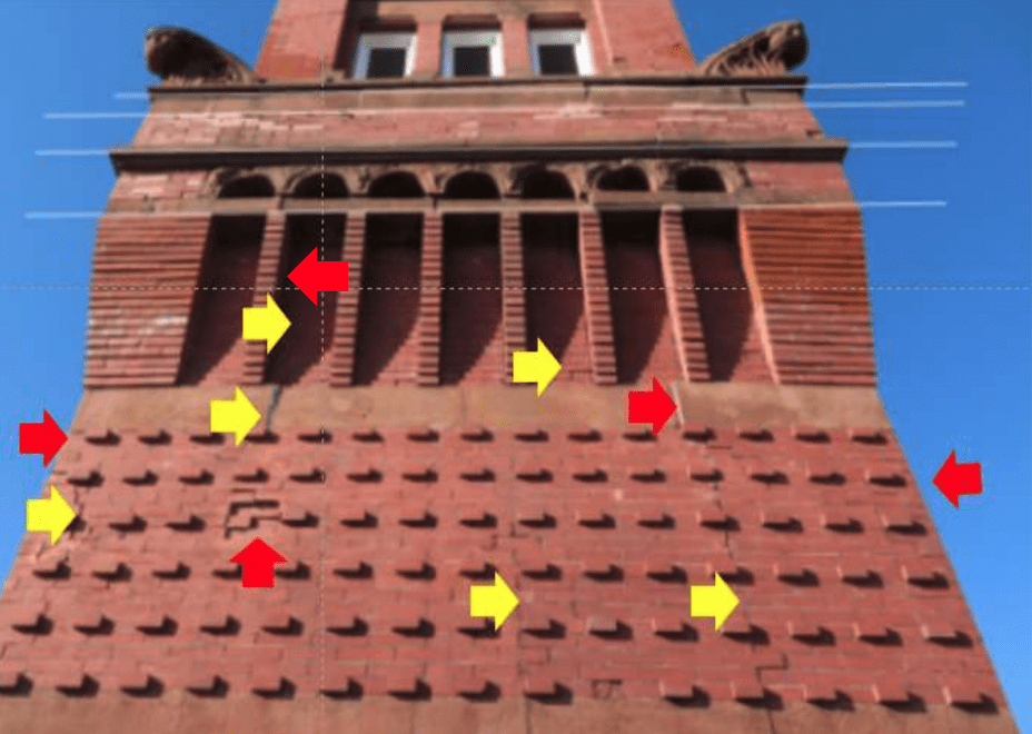 In December 2020, an area of the clock tower façade collapsed (see box on Figure 8 for location). This area had been deemed Critical in the assessment report and was slated for repair and rebuilding. The assessment report provided photographic documentation of the condition before collapse (Figures 9 and 10). The arrows have been added to the report photograph; red indicates an area of bulging brick, and yellow signifies significant cracks.