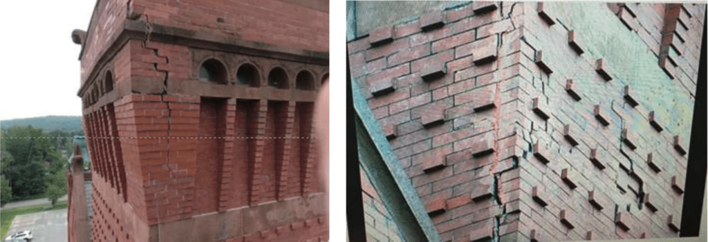 Together these two examples of tower stabilization indicate that the solutions vary based on the conditions of the masonry and the condition of the overall walls or buttresses. Every building has to be individually evaluated.