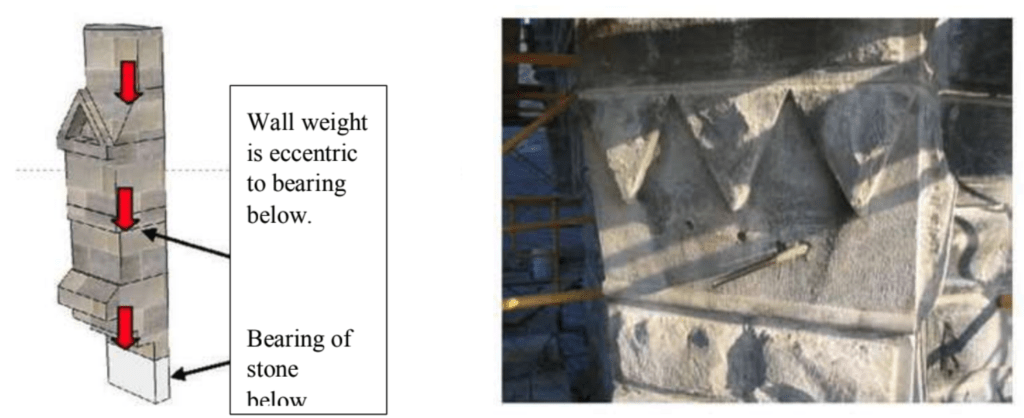 The concept used was to install pins into the stones above the area to be removed and encircle the upper stone of the tower with cables to retain the stone tight at the corners.