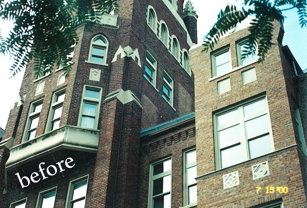 Attention is in the details for any successful project, and it is important in this Case Study that we were able to document what the newly stained brick looked like 21 years ago. The Masonry Cosmetics Team’s photography was not as advanced then as it is today, but it did capture the results of our extensive work at that time. We went back in 2019/2020 to retake pictures showing how our project still looks today. Examples are given here illustrate the before, during, and after stages of the project 21 years ago, along with current photos of that building today, proof positive of the longevity success of the Proven Masonry Stain.