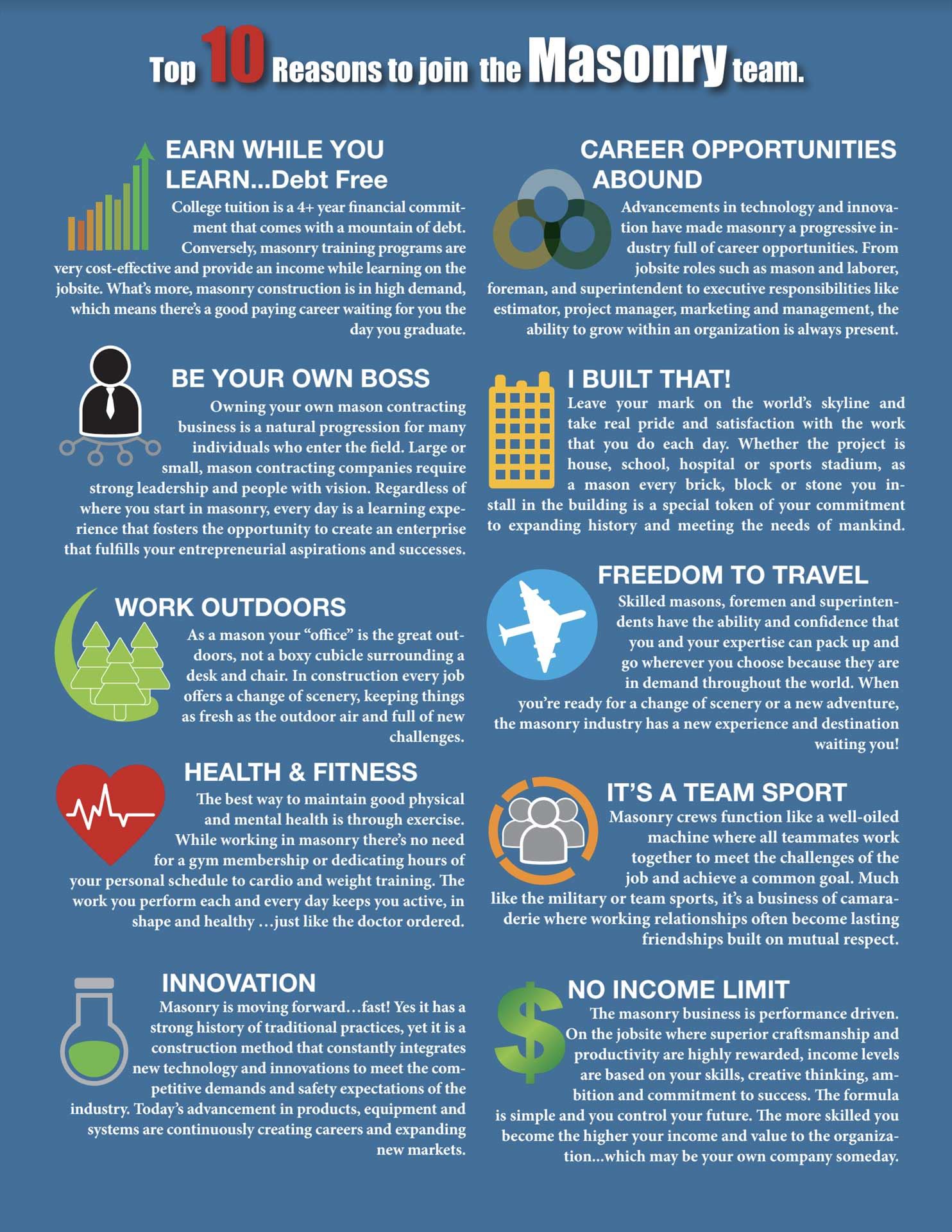 The masonry industry offers great benefits including advancement opportunities, job security, paid training, and financial strengt